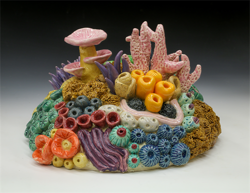 | Description: | For this piece I was very inspired by the unity of the ocean, for coral reefs are full of color and different species yet everything flows together creating one unified community. I used mostly transparent glazes to highlight the carvings and details of each induvial piece of coral. I used transparent laze to show texture , Used bisque mold to create base , Used kitchen strainer to create grass like coral , Used needle tool and sgraffito to create tiny details/texture |