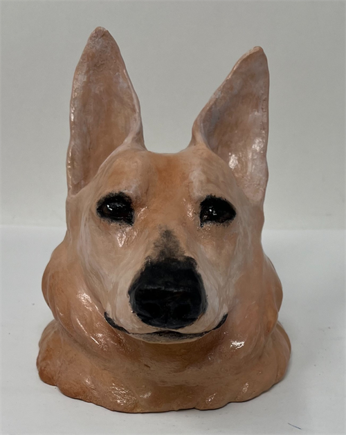 | Description: | The sculpture is designed from my dog ruby i chose to design it off her because she because means a lot to me. I made this sculpture out of raku clay. O started pff first by making a ball of clay and hollowing out a small piece on the bottom sticking it on a pyramid for the neck. afterwards i defined her facial feature onto onto the head and getting the main shpe of her face. after that i added the fur with long peice of clay wraping around the head and neck and i smoothed it out after puting it on. After i hollowed out the the bottom of the piece then i cut off the top of the head and hollow the head out and the snout. I reconnected the the top of the head by using slip and scratching it on and smoothing it out. a the end of assembling it i put on the ears and painted it with acrilic paint and let it dry. lasty I used floor wax to make it shine. |