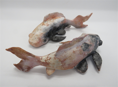 | Description: | The fish were hand sculpted. This set was created using aluminum foil saggar firing, and depicts two koi fish in their classic yin and yang positioning. The unique coloring came from a variety of different materials including banana peels, plant fertilizer, salt and sugar. This combined with ferric acid was then wrapped in aluminum foil to create the final product, with mixtures of reds, oranges, browns, and black. |