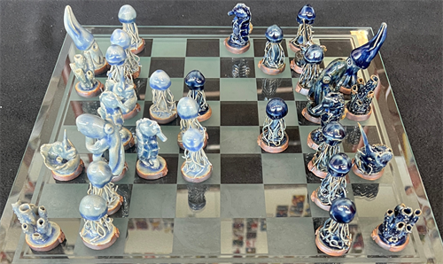 Description: Chess set - each individual piece developed and made individualy by hand. Displayed on a glass chees board.