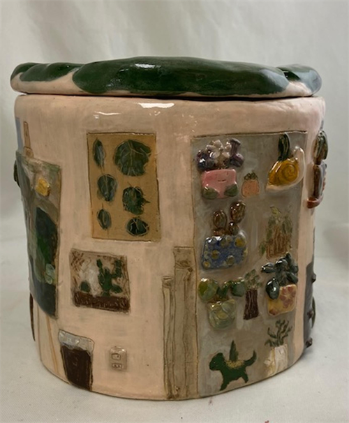 | Description: | This piece is a functional lidded form with emphasis on surface design. The student used slab construction, additive and reductive surface design techniques and underglazes to create realistic imagery of a specific place. The student's project statement is: "This piece represents me and parts of my life. I reference several of my past artworks including paintings, prints, and other ceramic pieces that I have done. The plush frog that is on the bed is a staple in my ceramic pieces." |