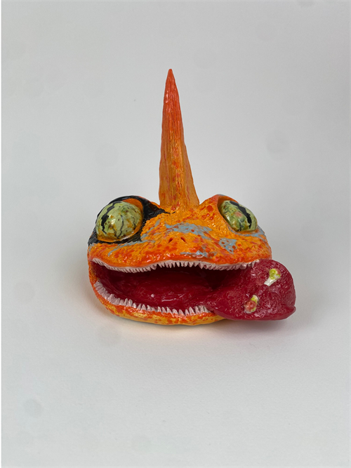 | Description: | In my ceramic sculpture of a lizard’s head, I used vivid colors to create a Punk Art vibe and texture to make it life-like. This is glaze brushed on and fired in electric kiln to cone 6 glaze. |