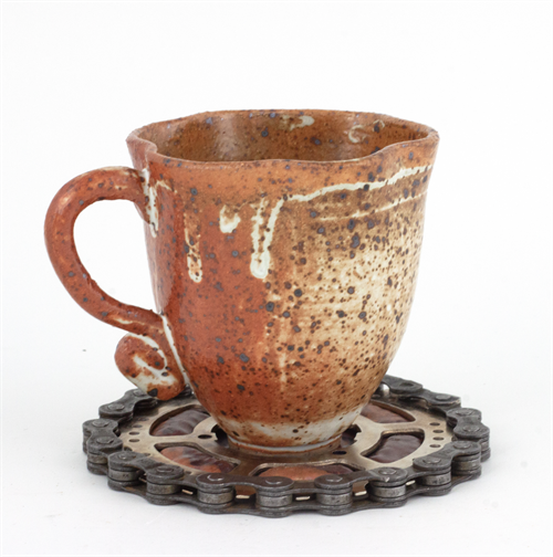 | Description: | This is a teacup made with cone 6-10 stoneware clay, wheelthrown, and cone 10 reduction fired. The saucer is mixed metals, soldered together to create a bike gear saucer. |