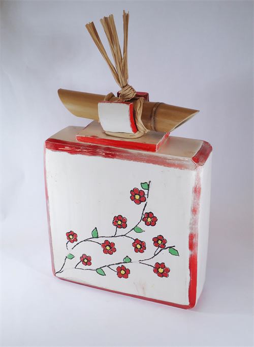 | Description: | White earthenware box with red flowers on the front and red sides and back. Also has a bamboo handle. |