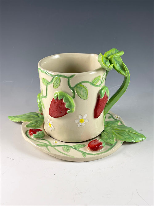 | Description: | Hand-built cup with saucer, decorated with sculpted, applied strawberries, leaves and vines, as well as incised decorations, and accentuated with underglaze |