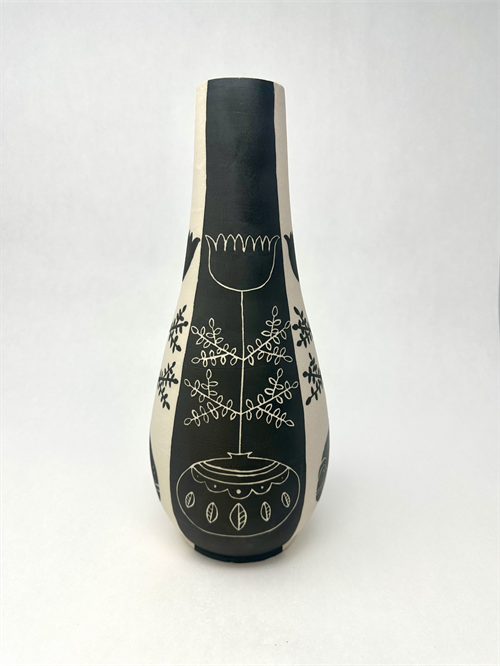 | Description: | Wheel thrown, hand carved sgraffito design, Amaco velvet underglaze, celadon glaze, Laguna B mix, cone 10 reductio. This is imagery that reminds me of my grandmas house growing up, running around and catches glimpses that bring back joy to this day. |