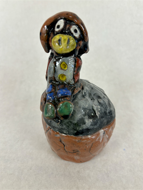 | Description: | The low-fired, hand-carved jewelry cup sculpture with a lid, crafted using pinchpot techniques, serves as a heartfelt tribute to my grandma. It features a cartoon-like character sitting on top of a hill, adding a whimsical touch to the piece. |