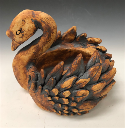 | Description: | Wheel thrown bowl; Slab feathers; coiled neck; sculpted head; bisque fired; Red Iron Oxide use; fired to cone 10 |