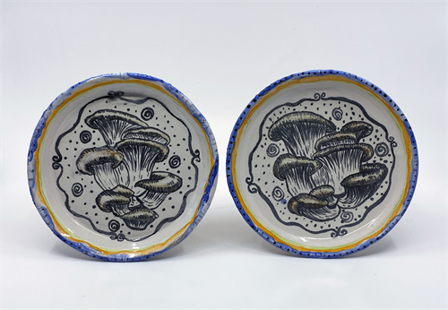 | Description: | Wheel-thrown plate set with maiolica-inspired decoration depicting oyster mushrooms. The plates were made using white stoneware covered in white glaze, with underglaze decoration on top. Fired to cone 6. |