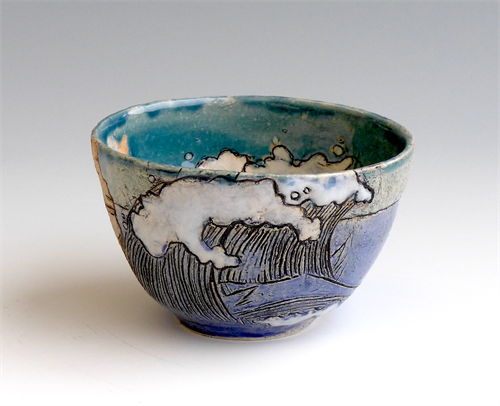 | Description: | A bowl with a an idealized Wisconsin landscape and a dangerous wave on the other side threatening the landscape. The surface decorations is on the front and conitnue into the interior bowl in a homage to Waybe Higby. Thrown and trimmed bowl with sgraffito design |