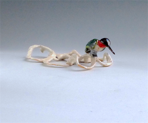 | Description: | A ruby throated hummingbird sits on a six pack holder. The bird is modeled, the six pack holder is coil. custom mixed undeglaze. |