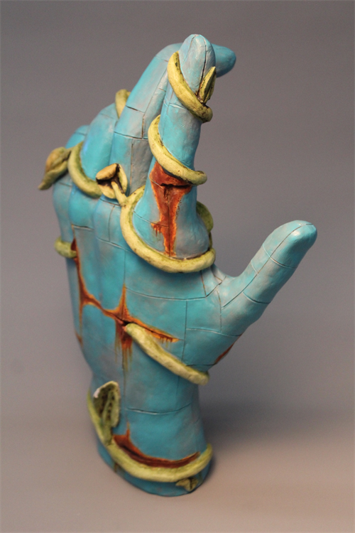 | Description: | The work is hand-built using slabs. The student carved lines and added vines and leaves. Idea development is based on natures dominance over all things. The final surface was created using cold surface techniques to mimic an old car, being overtaken by plants. The form is meant to represent the human population, and create the connection that we can also be overtaken by nature. |