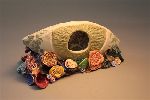 | Description: | Hand-built using slabs, the flowers were added after the glaze firing. The final surface has decals, underglaze, and glaze. This work is about perception. |