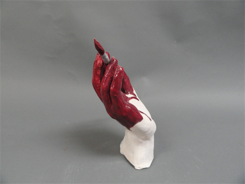 | Description: | This hand was sculpted in porcelain clay. the brush shaft is wood , however the brush is made out of clay and glazed. The hand is glazed in low temperature Amaco glaze. |
