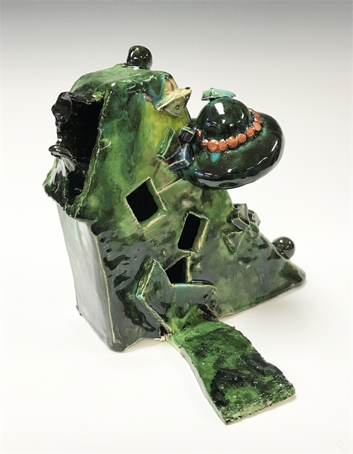 | Description: | This slab built sculpture depicts a UFO crashing or invading into a building structure. It is low fired with rub n buff accents. |