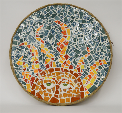 | Description: | This entry is a mosaic built upon a circular wooden board that is approximately an inch in depth. The tiles in the piece are hand made using Bracker's Good Earth white clay that was glazed with Mayco and Ducan crystal glazes, as well as Duncan Envision glazes. Holding the tiles is a white grout and wire mesh drilled into the base. Art piece inspired by the artist's mother and her comforting words. |