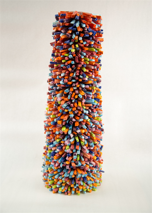 | Description: | Mixed media ceramic sculpture/vessel with Cone 05 glazed pieces attached to constructed clay vase. |