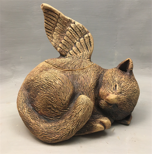 | Description: | Pinch pot lidded jar of sleeping cat with wing. Created entirely at home during distance learning. |