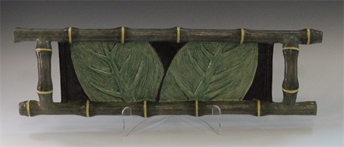 | Description: | The slab constructed serving tray has a lip and handle that sculpted to appear as bamboo. The leaves are added clay a carved for texture. Celadon glazes were used on the flat serving area and Velvet Underglazes were used on the lip and handles. |