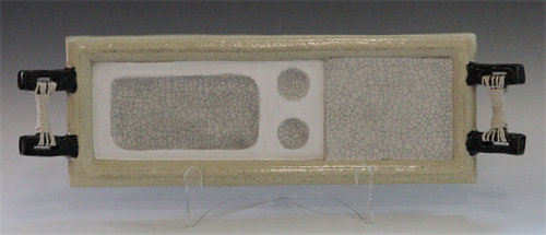 | Description: | This is a slab platter with recessed areas. The handles are grooved slab wedges with twine wrapped around the slab braces to form the handles. |