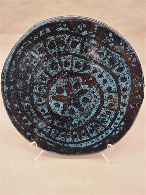 | Description: | Earthenware plate with thrown foot and wax resist glaze decoration |