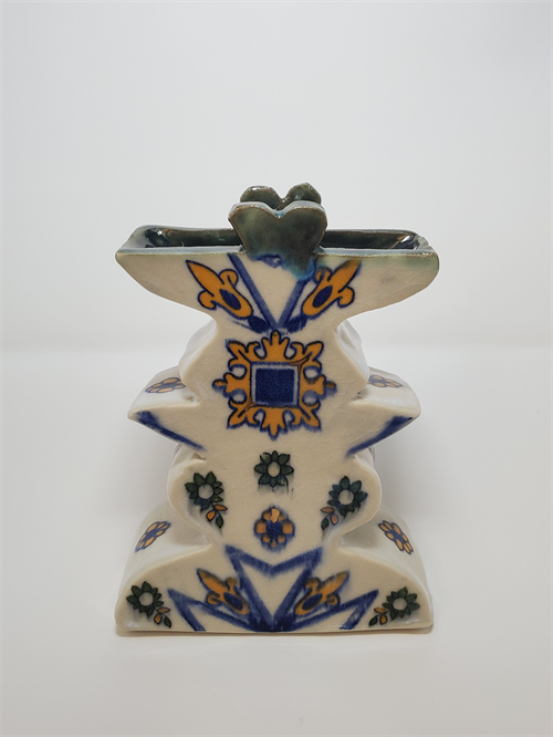 | Description: | I made a slab built vase with designs on all sides using underglaze transfer paper. I used a clear glaze for the outside and a blue glaze for the inside of the vase. After it was fired, I also added gold luster in 6 different places to highlight the shapes of the transfer paper designs. |