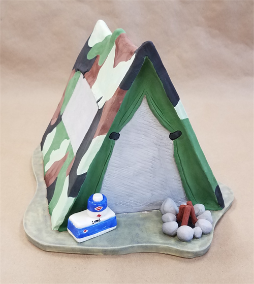| Description: | Pack up your camping gear and head up north! This clay slab constructed tent with a camo pattern and window screen texture is realistic on a small scale. A tiny campfire, fishing pole, tackle box, and coolers add to the realistic details. |