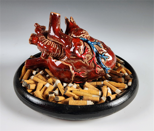 | Description: | Realistic handbuilt stoneware heart atop a pile of burnt cigarette butts in a wheel-thrown stoneware dish. |