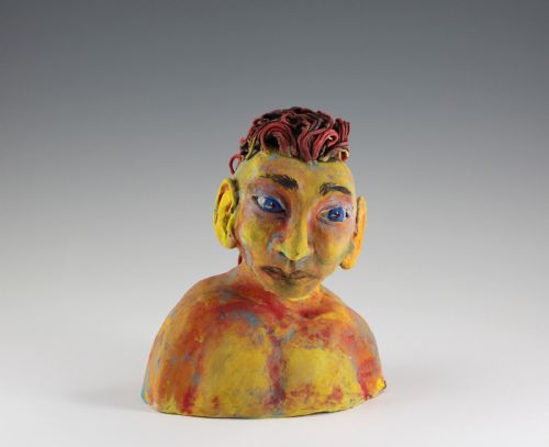 | Description: | This bust is made of Cone 6 Speckled Buff clay bisque fired to Cone 05. Amaco Velvet Underglazes were used after bisque firing to Cone 05. The underglazes were applied in 2 separate Cone 05 firings. The title comes from Mohawk name for themselves "The People of Flint Stone Place/ Ka Nee-en Ka". The color choice was inspired by German Expressionist painters Oskar Kokoschka and Otto Dix. |