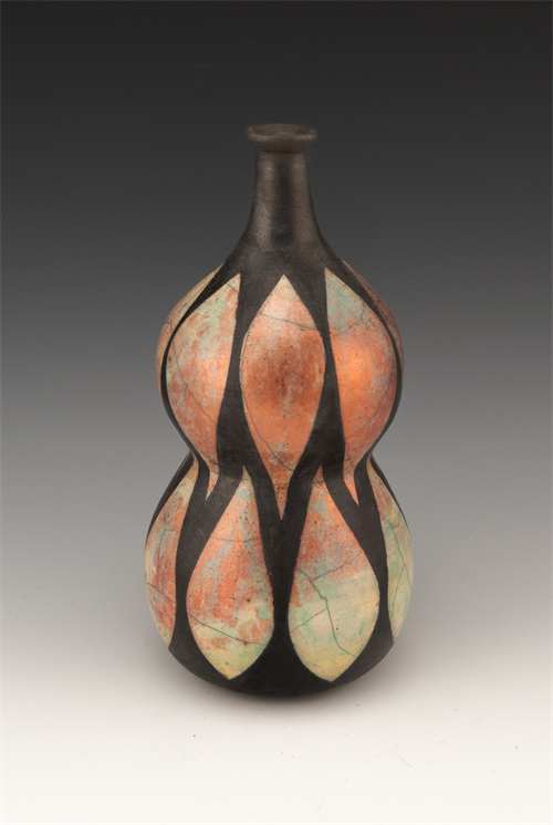 | Description: | Wheel-thrown vessel decorated with a cut tape resist design. Fired using traditional Raku reduction method to achieve glaze variation. |