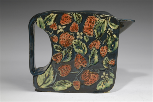 | Description: | This pitcher is a decorative recreation based on the 1930's collection of Hall China refrigerator ware. It conveys the cycle of a strawberry plant from flower and berry, then to jam. |