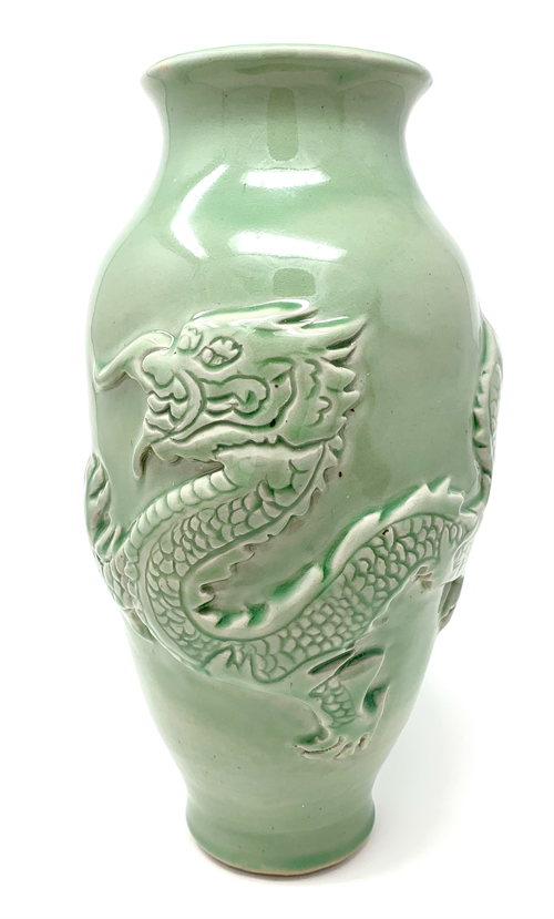 | Description: | Wheel thrown, hand carved dragon design, green celadon glaze, cone 10 reduction fired |