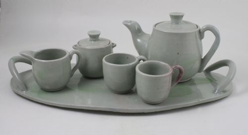 | Description: | Wheel thrown tea set with hand built tray. Student used "B-Mix" semi-porcelain. Fired in reduction to cone 10 with a Celadon glaze. Dimensions and weight given as a total for the set. |