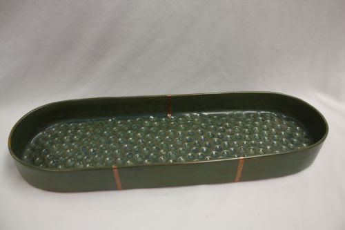| Description: | I came up with the idea through a school project to make a slab vessels. My piece has a total of 5 slabs that are blended together, four of them in the craves at the top and the last in the base. The indents in the bottom are the backs of random tools found in the class room. And finished with a a mix of Iron Moss and Moss Creek glazes and copper strips. |