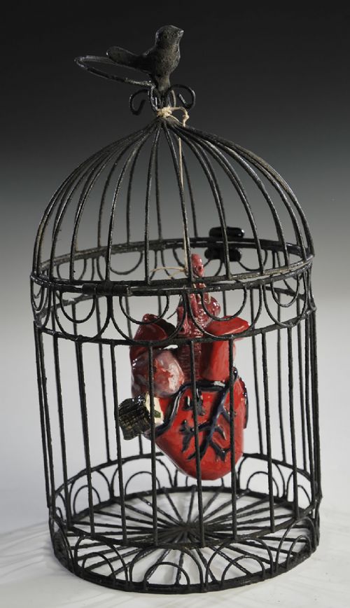 | Description: | My piece explores the human tendency to hide our true selves away. I sculpted the heart to represent our true, inner emotions, raw and untouched. The cage surrounding the heart is symbolic of the barriers we set up for ourselves. We hope that these barriers will keep our souls safe and protected, but more often, what they actually end up doing is pushing others away and making it harder for us to make connections and develop relationships. The tiny house I sculpted on the heart is representative of our “comfort zones” and the idea that because we feel secure and protected behind our bars, it is hard for us to open up to others and give away the key that is essential to unlock our true feelings. I played with the birdcage as a tool to compare the heart to a bird, a living, breathing, manifestation of the bounds of freedom. Just as the bird cannot fly when it is caged, the heart cannot truly love until it is set free. |