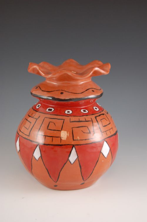 | Description: | Red Erathenware clay, hand built coils, underglaze, overglaze |