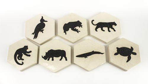 | Description: | The seven tiles represent the seven continents, and each animal represents an endangered species that is native to a continent. The use of black emphasizes a sense of loss. On closer inspection, a geometric relief carving can be seen within each black silhouette. ? |