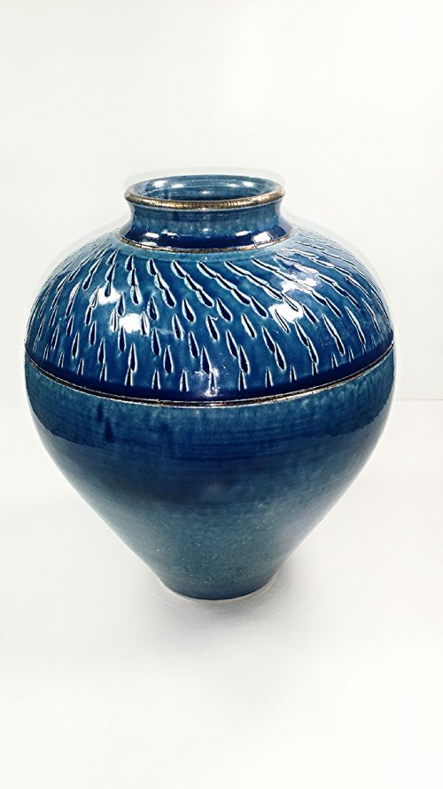 | Description: | Blue raku glaze on a bottle with gold strips. |
