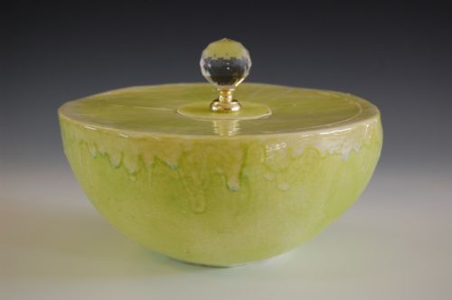 | Description: | Lime green half sphere, with a small flat round lid with a recycled crystal cabinet knob fro the handle. |