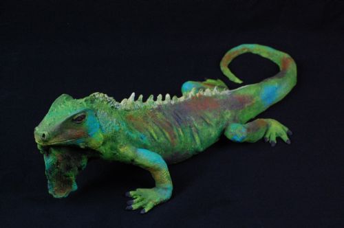 | Description: | I created this piece because I enjoy sculpting realistic animals. My intent with this piece was to look as realistic as possible. It was challenging to make this iguana balance well and show movement. I created it with white clay and used underglaze and painted it with acrylic paint to give it a more realistic look. I used slip and paintbrush to give it texture all over its body. |