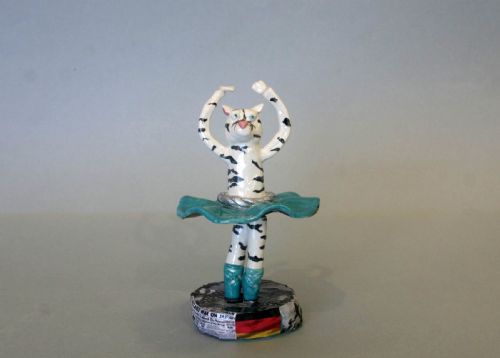| Description: | Art Teacher - Lindsay Wellman Mixed Media - Ceramic sculpture with paper collage added to base and bottom of skirt. Artist Statement: "Twirling Tiger" is a ceramic project inspired by the person I most look up to; Sawyer Player. Sawyer has many unique and extraordinary characteristics, ranging from kindness to talent, humor, and respect. Not only do I look up to her because of her talent but her way of being her own person, as well as her compassion toward everyone plays a major impact in my admiration of her. A tiger was my immediate choice for an animal representation of Sawyer. A tiger's confidence, elegance, and tenderness reflects and describes Sawyer very well. To anthropomorphize my ceramic animal I created a big, flowing tutu and blue pointe shoes to reflect Sawyer's love and talent for dance. I have learned from Sawyer that you do not always have to care about what other people think of you and to always be better than yourself than to others. |