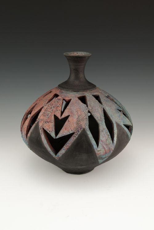 | Description: | Raku bottle with diamond piercings covered with a matt crawl copper glaze and raw black. |