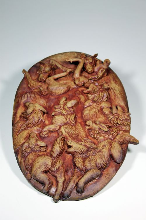 | Description: | Tapestry style relief of a wolf pack taking down a young elk. |