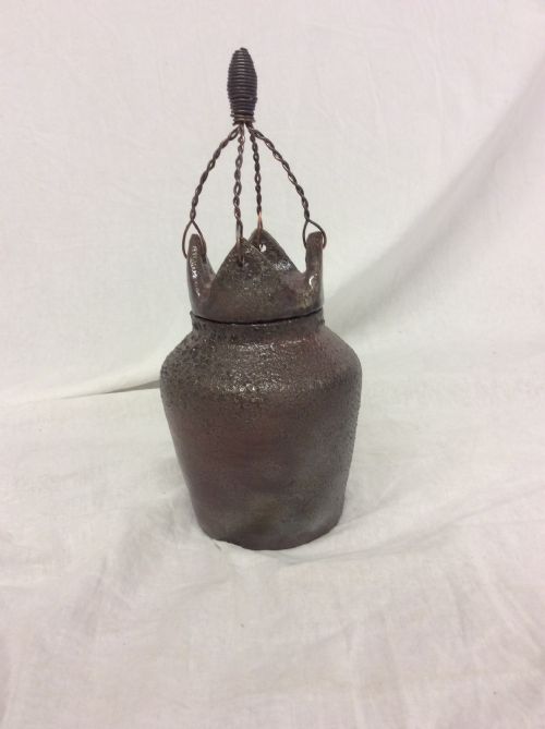 | Description: | The jar was Raku fired and finished with a braided wire handle. |