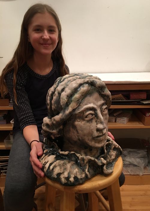 | Description: | Hand-sculpted clay head, predominantly realistic facial features with oversized coil attachments for hair. White low fire clay body with Duncan Artisan Glazes applied for finish; Glazes partially wiped off at time of application for irregular shading effect across form. |