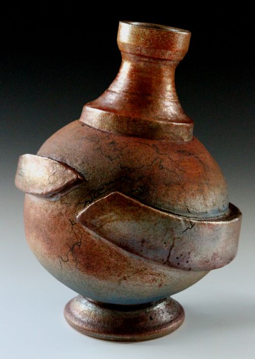 | Description: | This handbuilt bottle was made with raku clay. Cone 6 glaze was fired first then the underglazes were sprayed on and fired to cone 05. Once the bottle cooled to 1300 degrees it was pulled from the kiln and horsehair and sugar was placed on the body of the vessel. Finally, ferric chloride was sprayed on the wheel-thrown neck, handbuilt body and wheel-thrown base to give it a fumed affect. |
