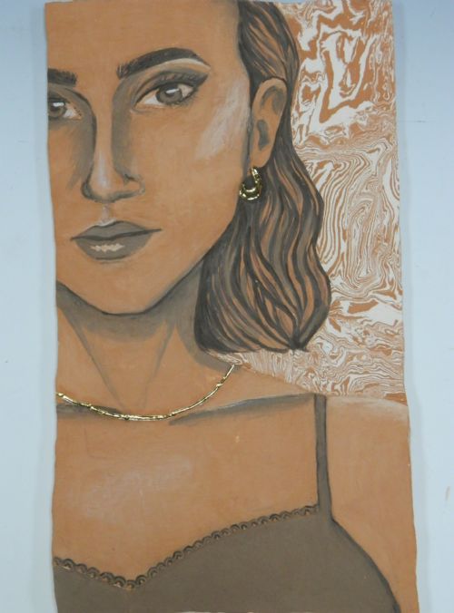 | Description: | To create my self portrait I wedged strips of red and white clay together to create a marbled texture, and then drew the outline of a self portrait onto the clay. I painted the outline first with red slip and added details with white and darker brown underglazes. As accents, I added gold glaze to the jewelry. The idea behind this piece relates to my portfolio's theme of generations and family. The title Daybreak is representative of the new and upcoming generations. The gold and orange-brown color scheme gives the piece the image of being hit by rays of sun as it breaks the horizon and the beginning of a new day. |