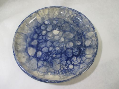 | Description: | White earthenware with a blue and gray bubble glaze. |