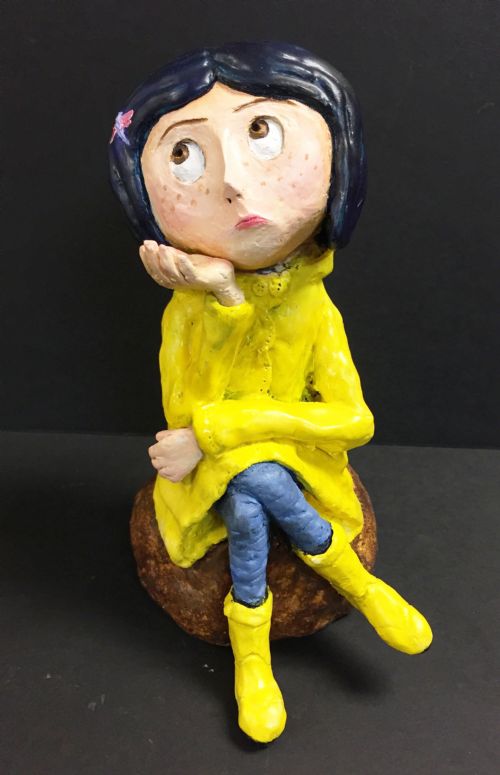 | Description: | When my teacher told us we’d be doing storybook characters, Coraline was the first to pop in my head. I read the book as a little kid and was first in line when the movie came out. People are constantly comparing me to Coraline so it just seemed right to chose her as my character. This project really tested me when it came to detail. Working with something so small was difficult but definitely helped me to sharpen my sculpting skills. |
