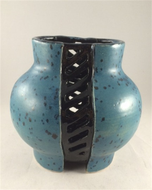 | Description: | Wheel Thrown, Split and hand built added section. Turquoise and Black Glaze. |